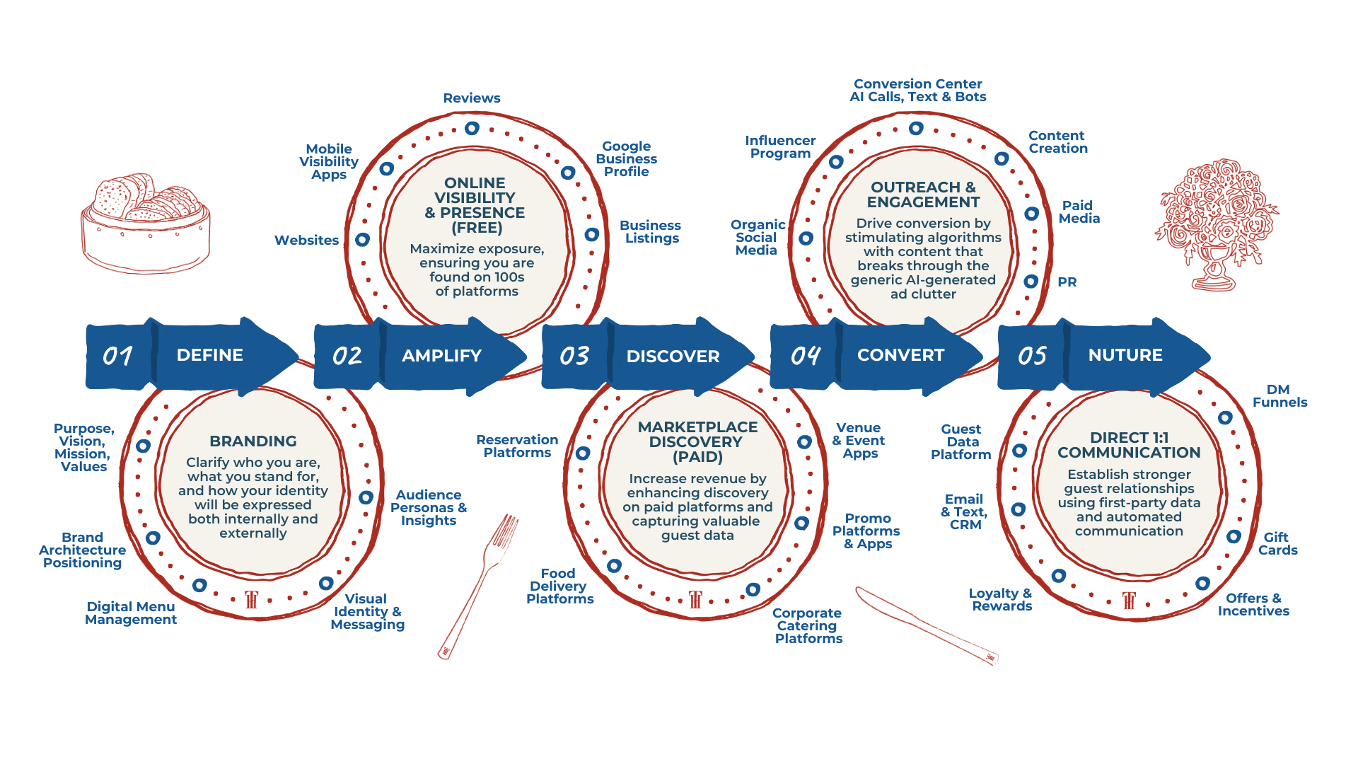 Our program isn’t just about singular tactics—it’s about the synergy of technology, creativity, and human behavior. By integrating data-driven strategies with compelling storytelling and personalized engagement, we create a marketing ecosystem that’s as dynamic as your brand. Let us help you serve up success, one plate at a time.